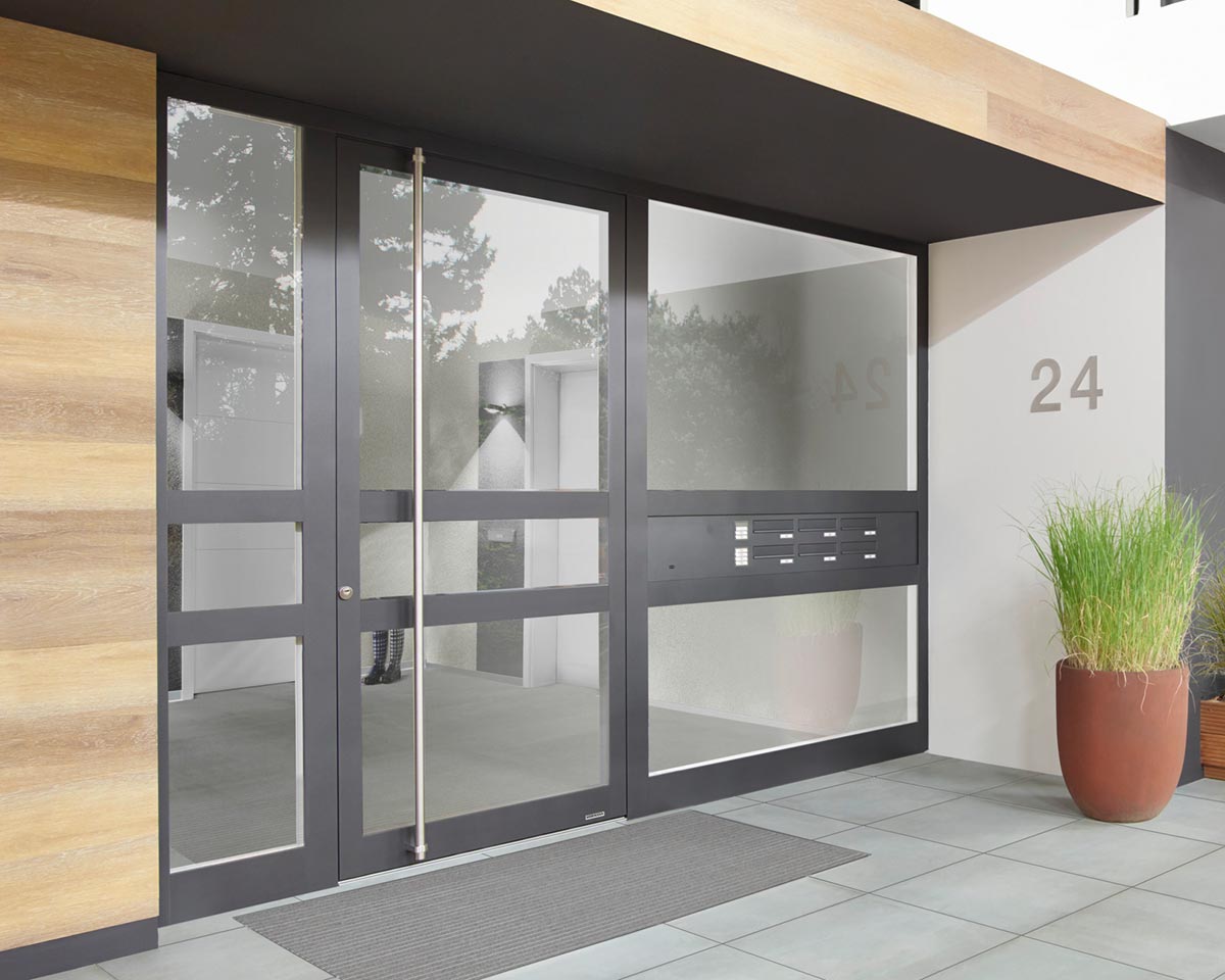 Haustüren aus Glas, wie die Hörmann Haustür TopComfort, sorgen mit großflächigen Verglasungen und Aluminium-Rahmen für lichtdurchflutete Hauseingänge und sind ideal für Mehrfamilienhäuser oder gewerbliche Eingänge geeignet. Sie verfügen über sehr gute Schallschutzwerte, gute Wärmedämmeigenschaften und sorgen mit optionaler Sicherheitsausstattung für den notwendigen Einbruchschutz.